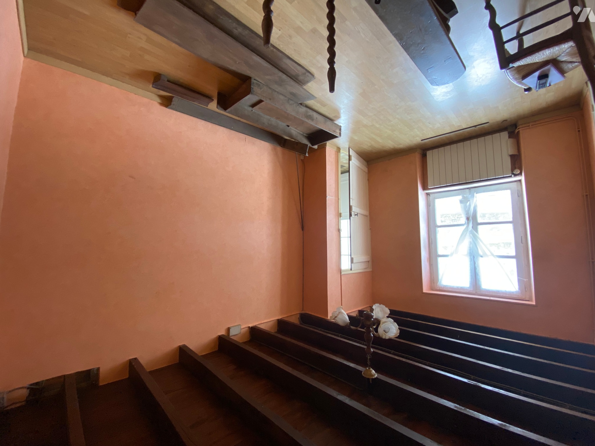 - Bureau (7 m²) avec radiateur, fenêtre donnant sur l’avant de la maison, poutres apparentes, parquet flottant,