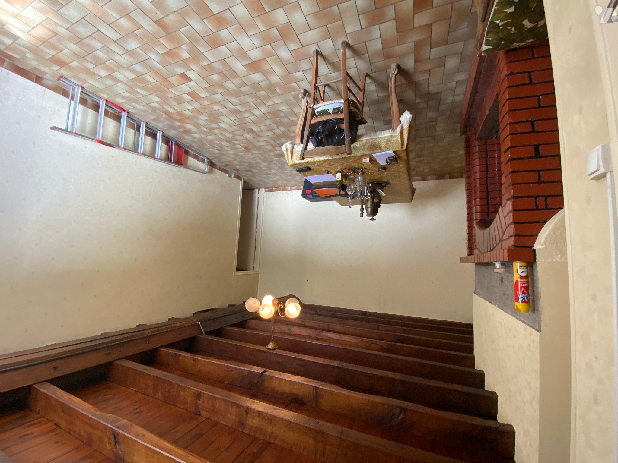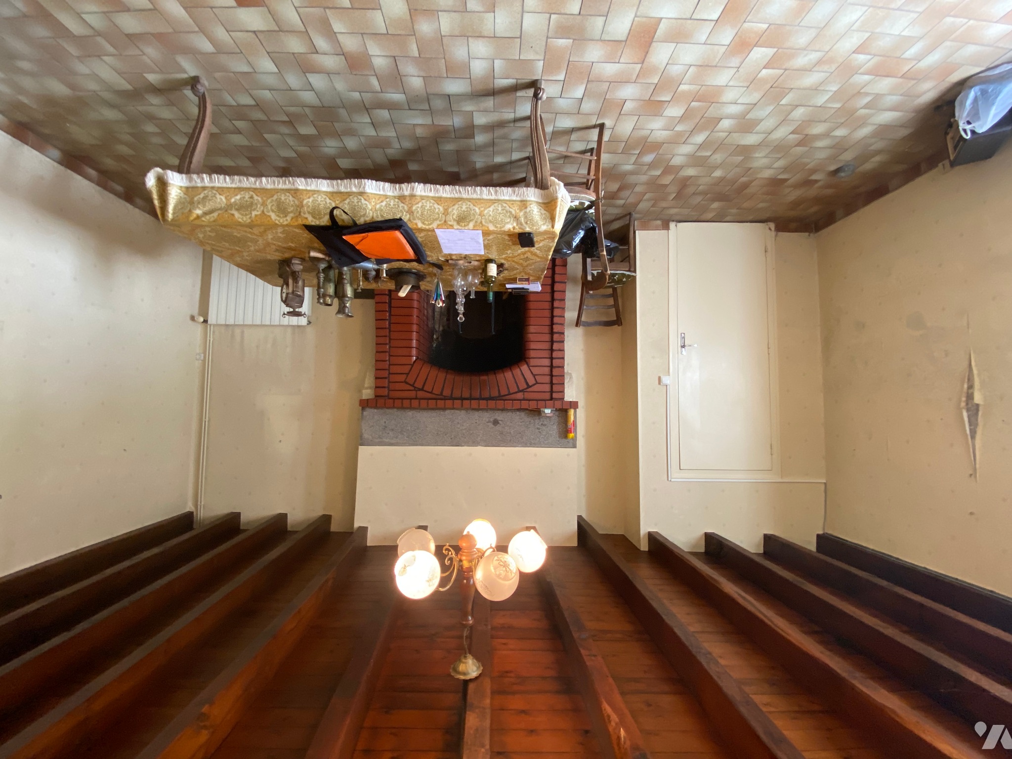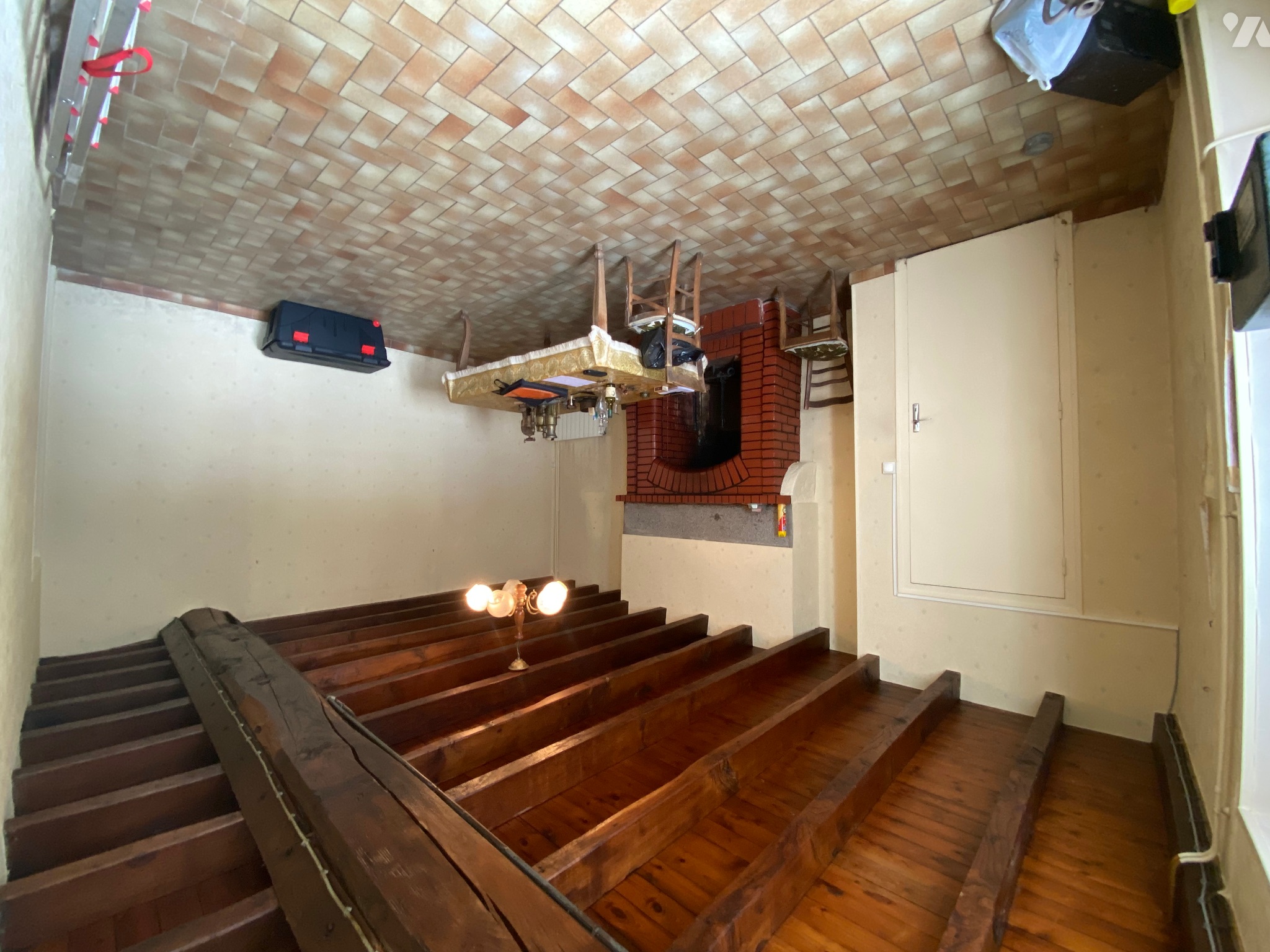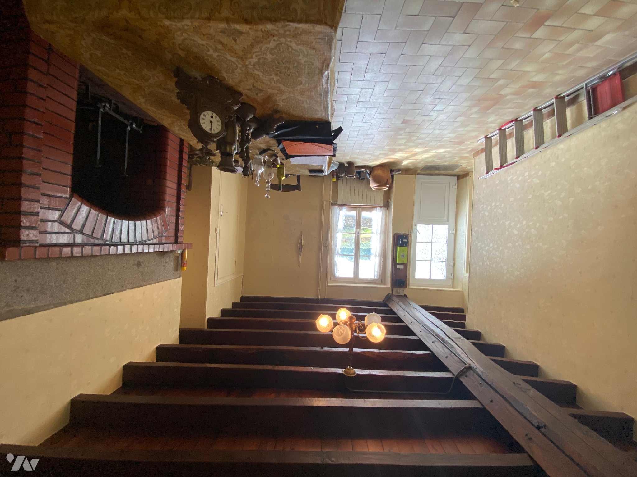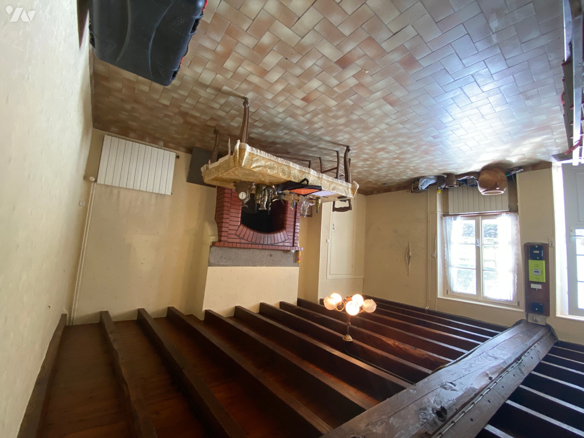 - Salon / salle à manger (21,6 m²) avec porte d’entrée, fenêtre donnant l’avant de la maison, poutres apparentes, carrelage au sol, deux radiateurs et cheminée, compteur Linky,
