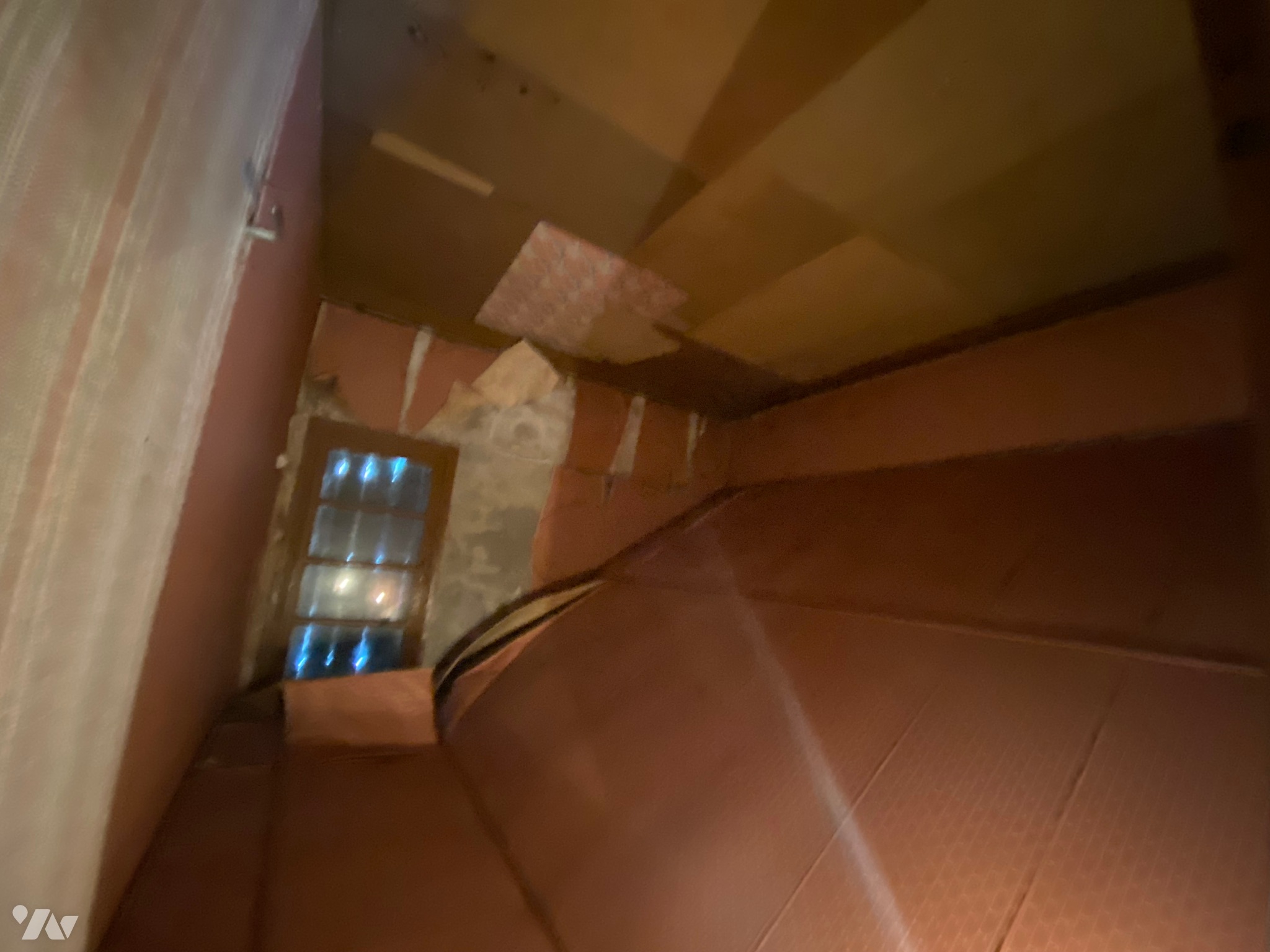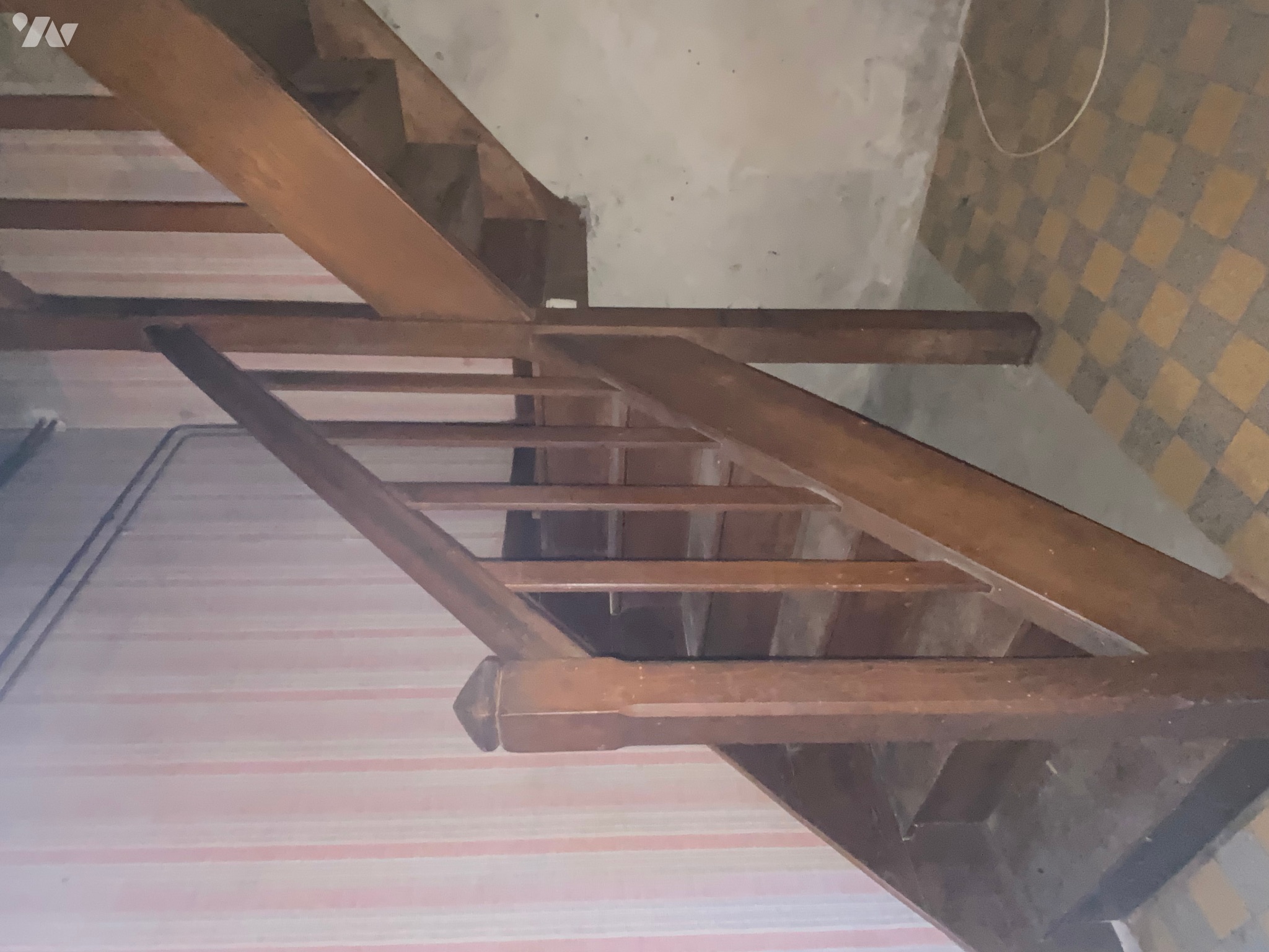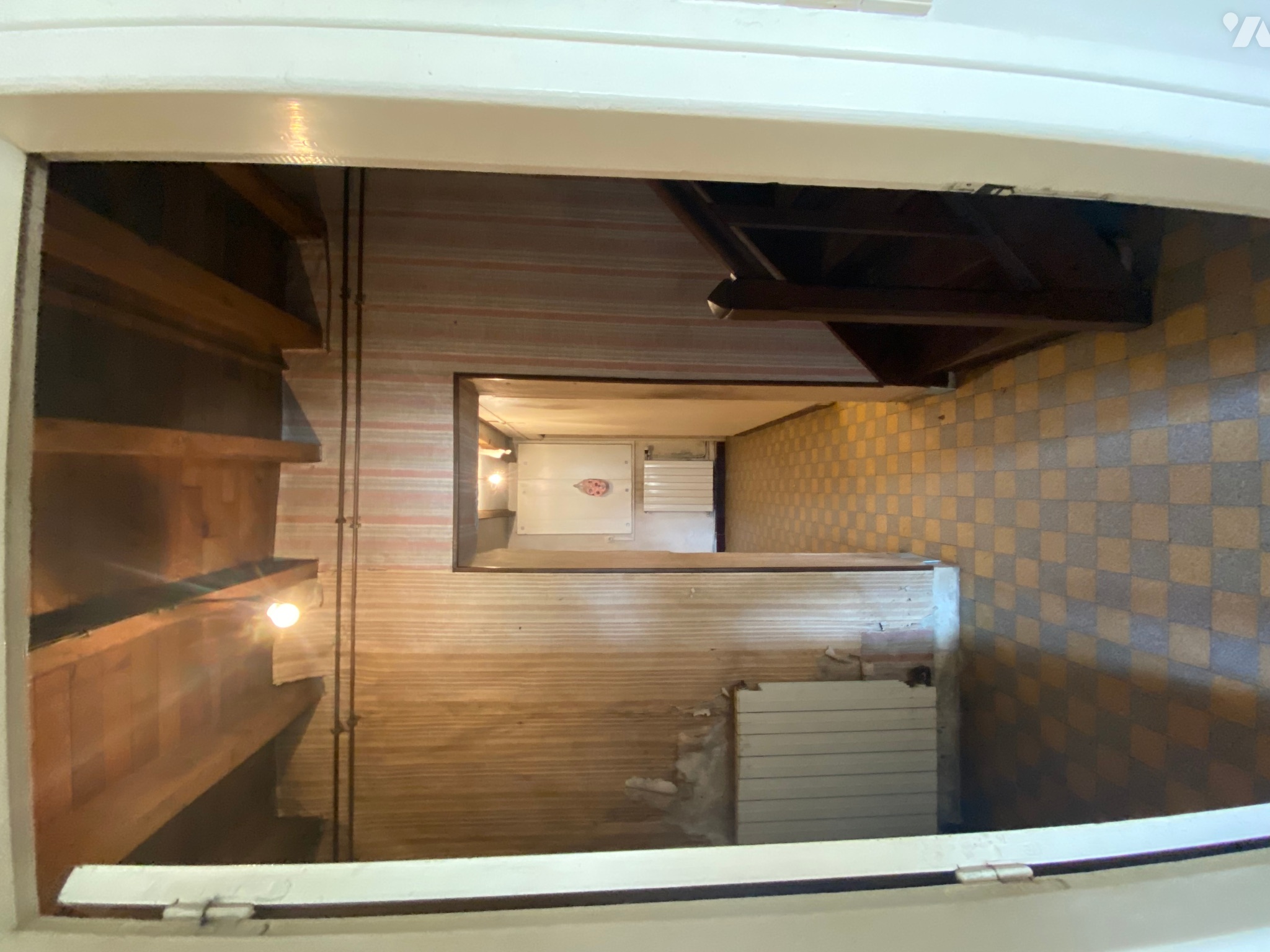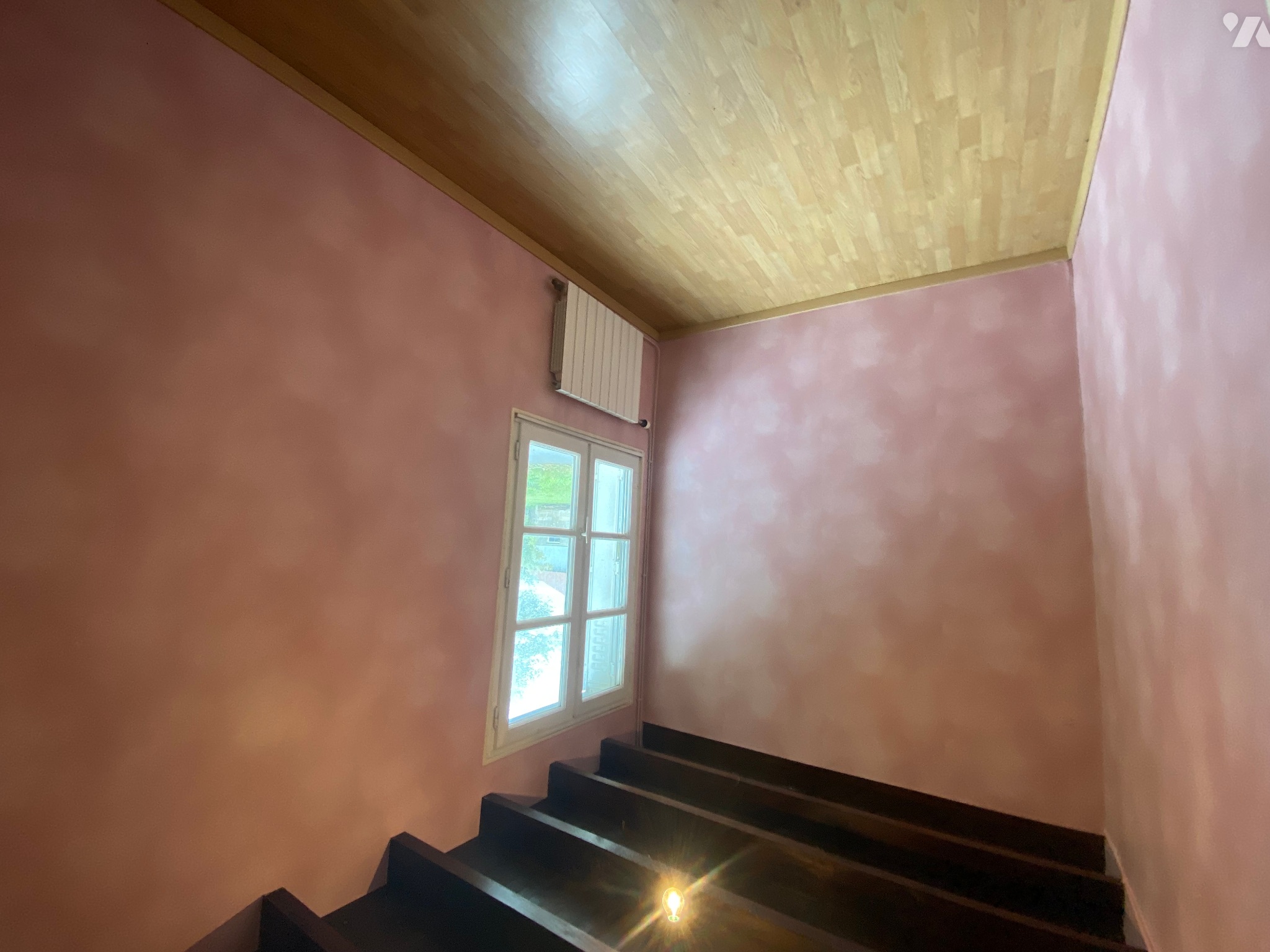 - Dégagement (5,9 m²) avec départ escalier en bois desservant le premier étage, carrelage au sol, poutres apparentes, radiateur et ballon d’eau chaude,