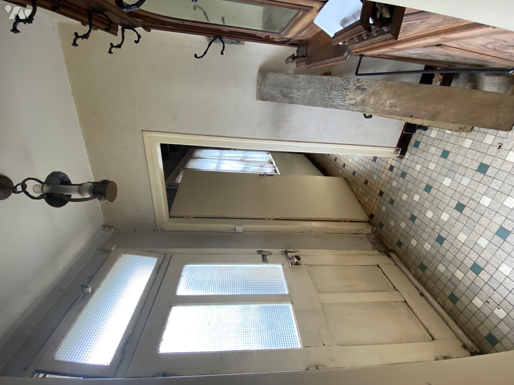 - Entrée (2 m²) avec porte d’entrée en bois et carrelage au sol,