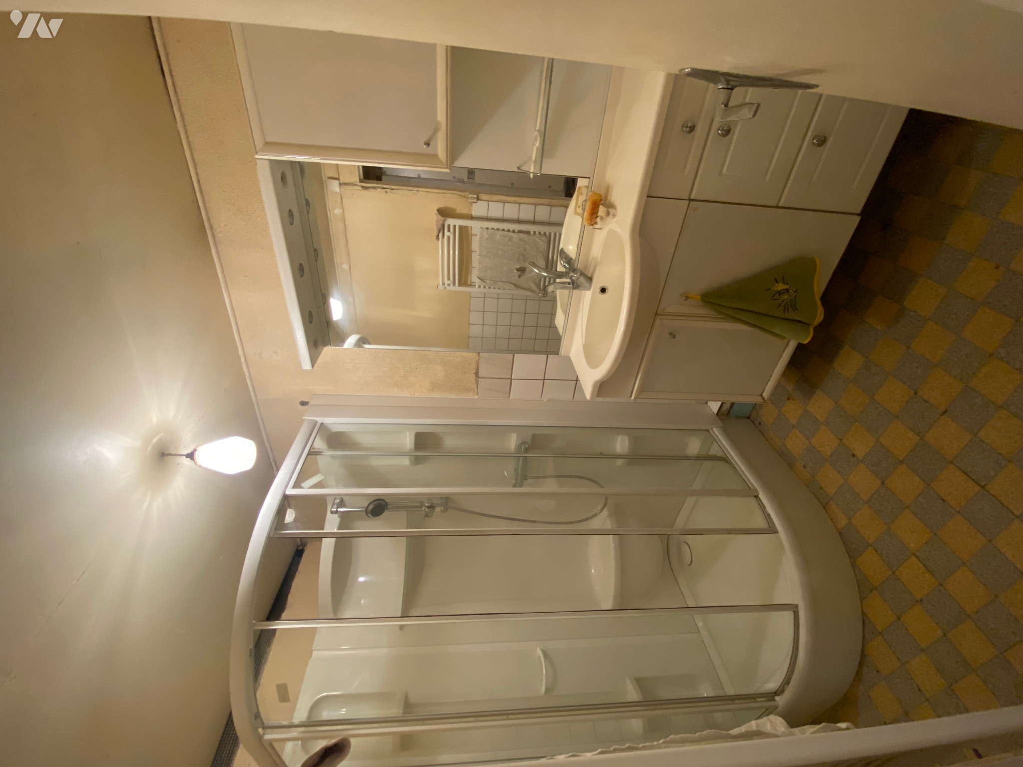 - Salle-de-bains (3,6 m²) avec douche avec mitigeur, lavabo, miroir et lumière, meuble sous évier, sèche-linge, carrelage au sol,